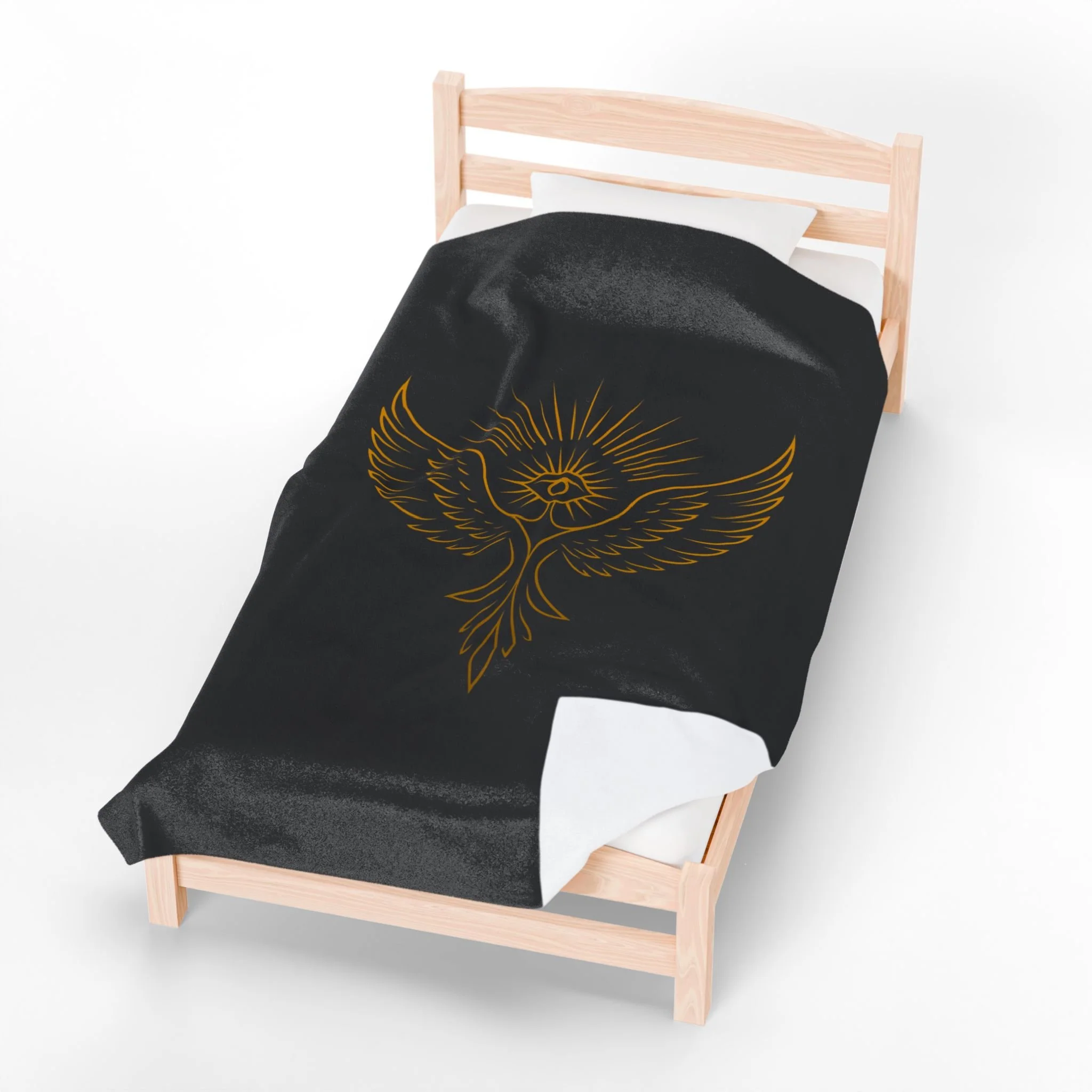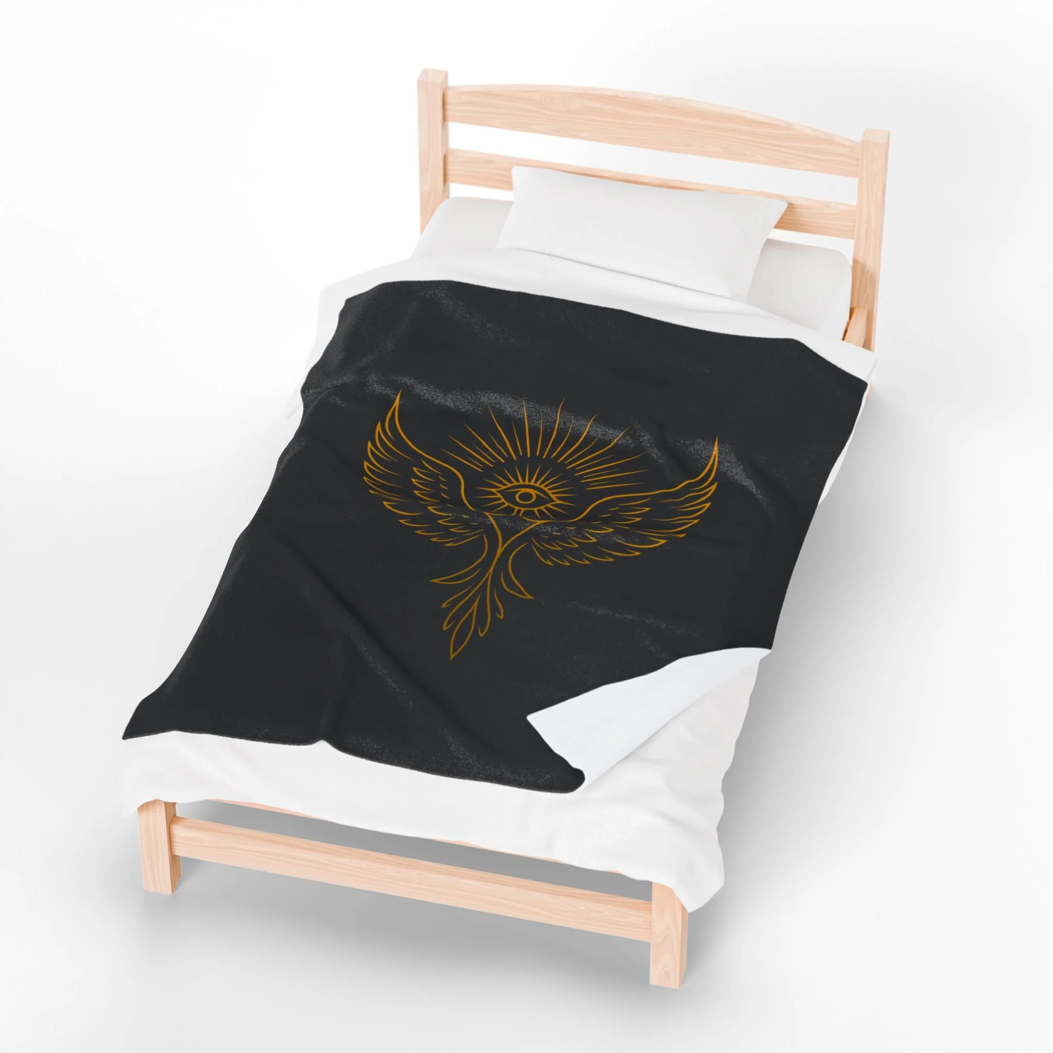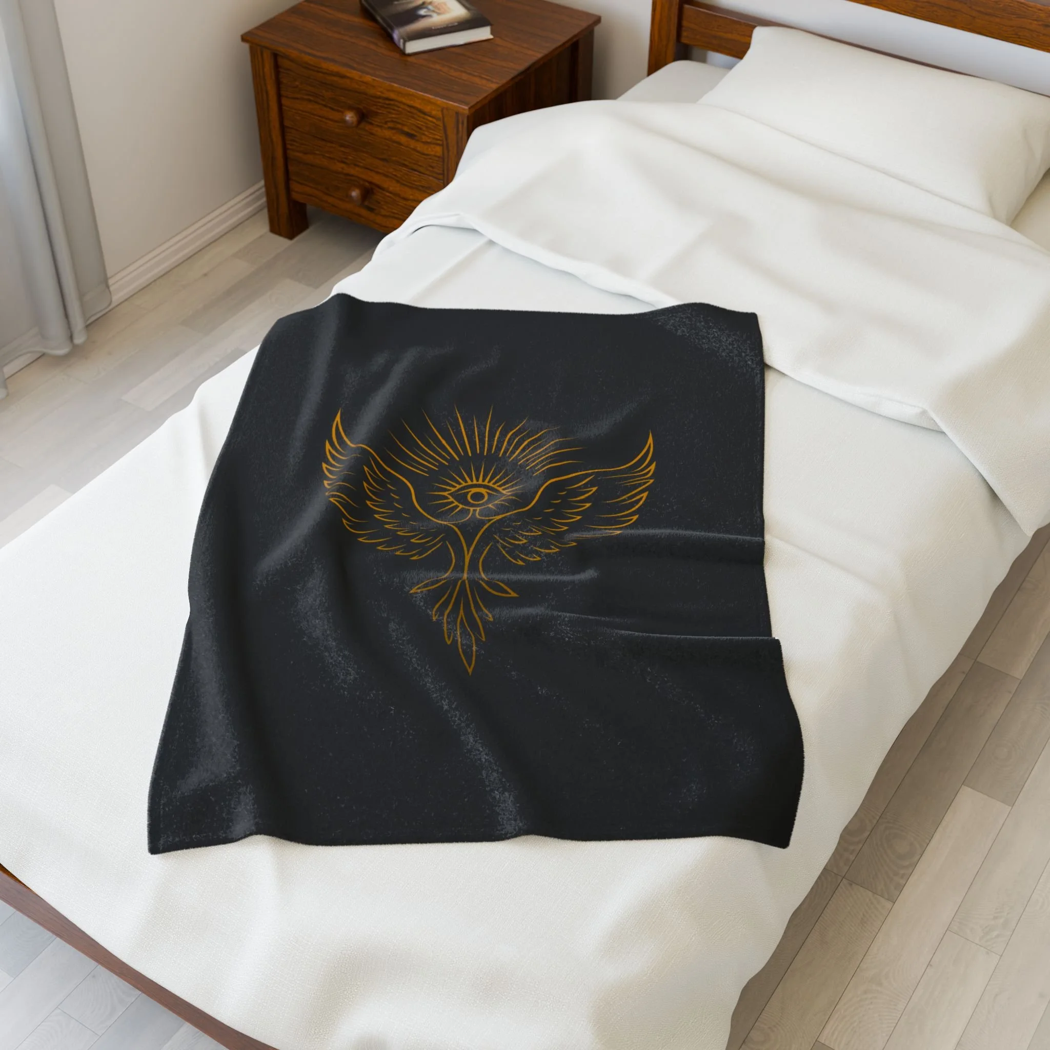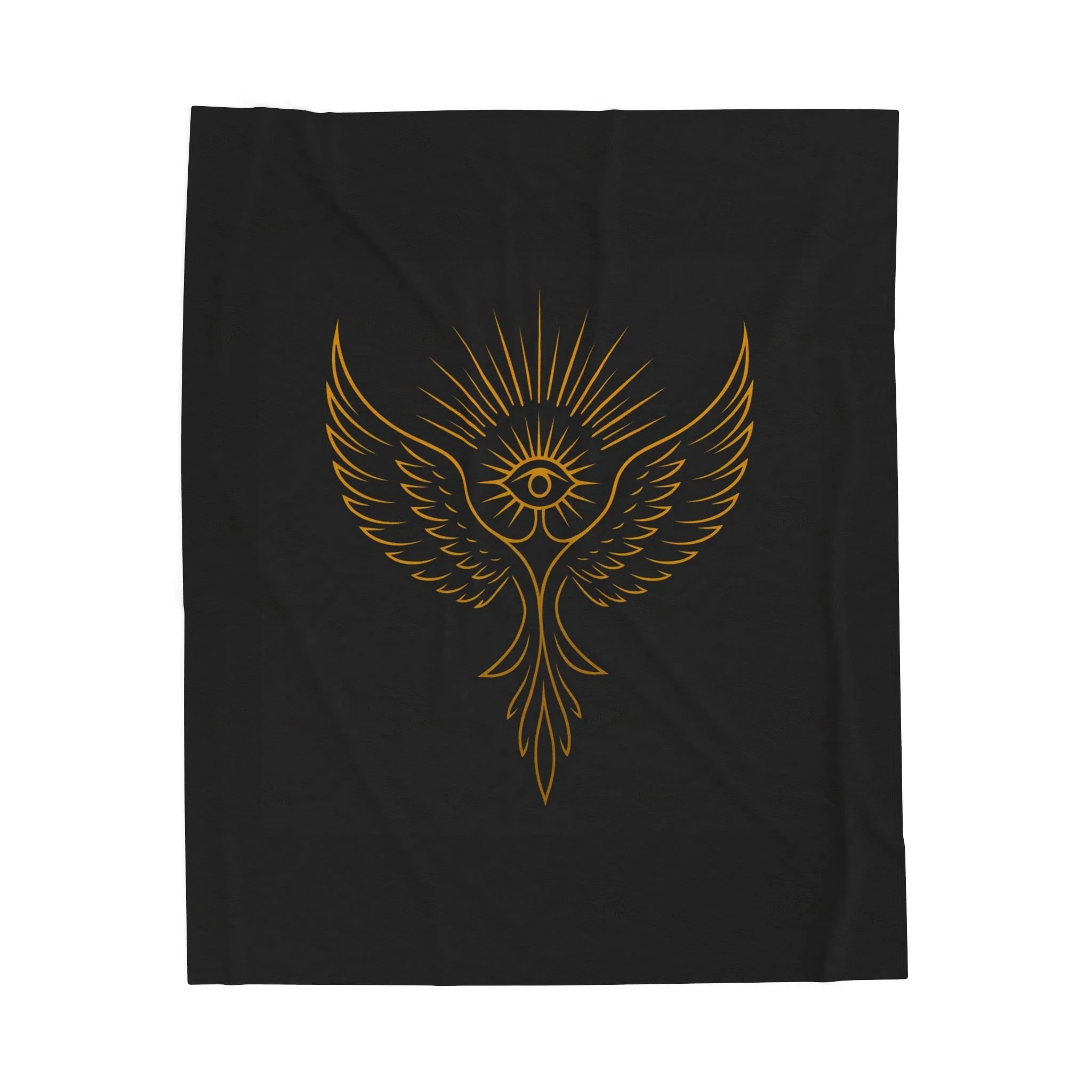 Wrap yourself in a quiet, sacred hush. This velveteen plush blanket pairs a silky, medium-weight hand with a bold, gold-ink Yellow Bird Academy emblem, an all-seeing eye cradled by upward wings and radiant rays. It drapes easily over shoulders during late-night tarot spreads, folds across knees while journaling by candlelight, or hangs as a soft altar cloth when you want the room to feel calmer and more intentional. The dark background makes the gold linework sing, creating a piece that reads more like a ritual talisman than ordinary home linen.